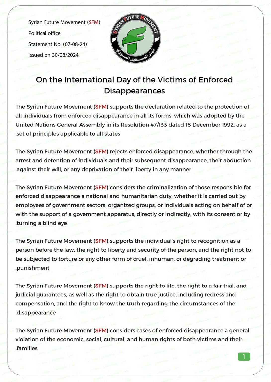 The Syrian Future Movement (SFM) supports the declaration related to the protection of all individuals from enforced disappearance in all its forms, which was adopted by the United Nations General Assembly in its Resolution 47/133 dated 18 December 1992, as a set of principles applicable to all states.