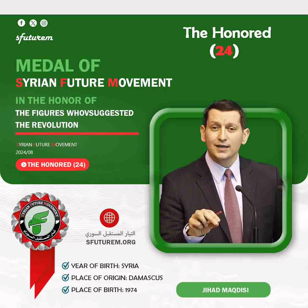 In the Syrian Future Movement (SFM), in recognition of his diplomatic, political, and then revolutionary history, and for standing with his people in their revolution against oppression and tyranny, and in appreciation of Syria’s great figures and men, we present the SFM Shield this week to the charismatic diplomat Jihad Makdissi, a symbolic Syrian shield that embodies our vision and national approach.