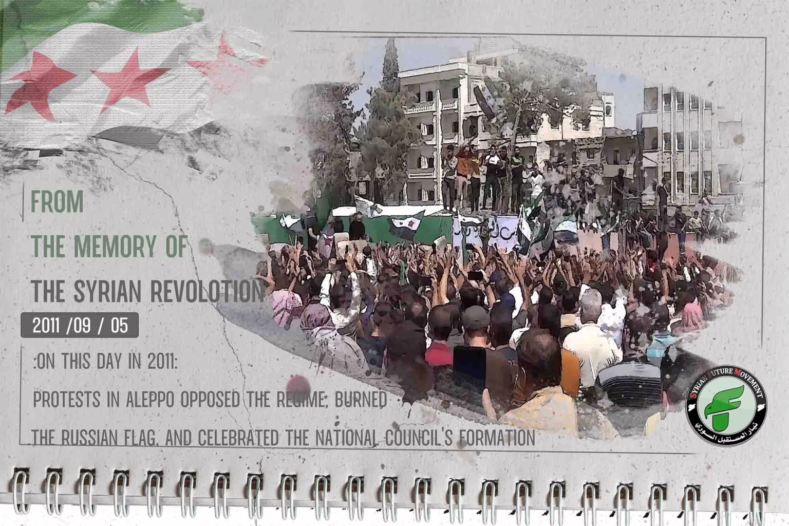 On this day in 2011: Aleppo witnessed protests in Al-Sakhour, Al-Marjeh, and Sheikh Maqsoud, with additional demonstrations in Al-Bab and Azaz. Protesters chanted against the regime, burned the Russian flag, and raised a banner congratulating the formation of the National Council.