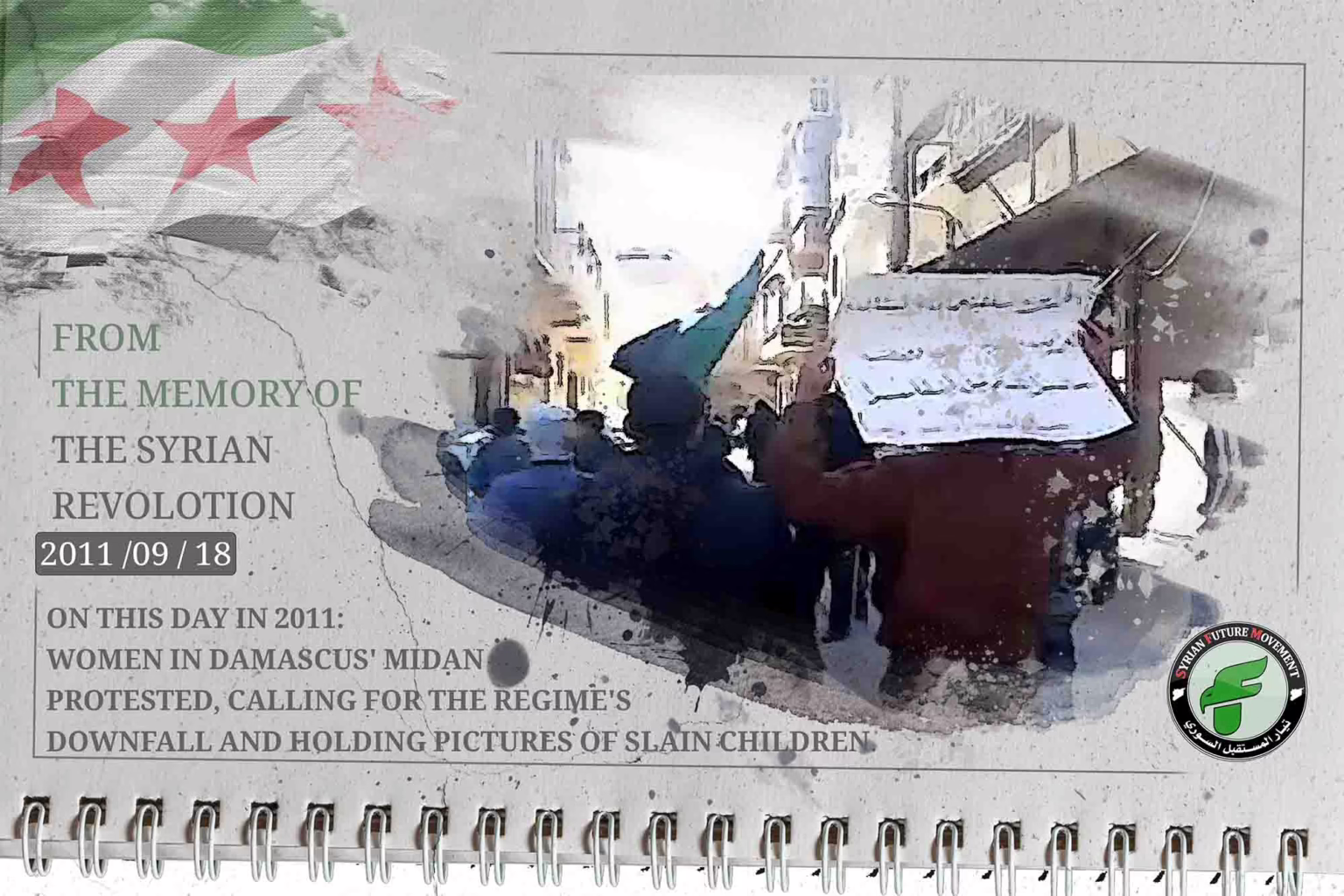 On this day in 2011: A women’s protest took place in the Midan neighborhood of Damascus, chanting for the downfall of the regime and holding pictures of children killed by it.