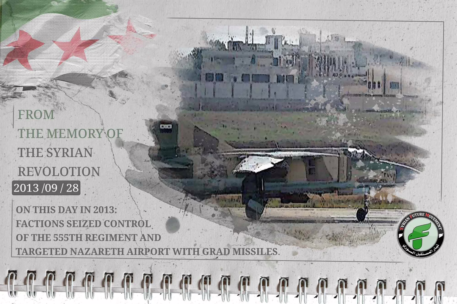 On this day in 2013: The factions announced their control over the 555th Regiment and the Air Intelligence checkpoint on the Nazareth road – the Dir Attiyeh intersection, as well as the train station and the Hajan checkpoint, seizing tanks, weapons, and ammunition, and targeting the Nazareth Airport with Grad missiles.
