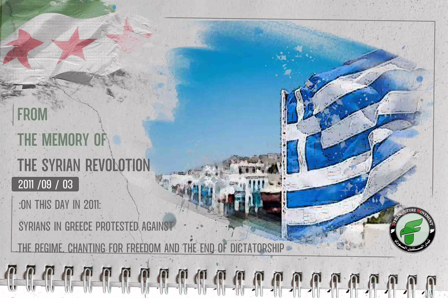 On this day in 2011: Dozens of members of the Syrian community in Greece demonstrated against the Syrian regime. They carried a large number of independence flags along with some Syrian flags (the red flag) and chanted slogans calling for the downfall of the Syrian regime. They urged the people and sheikhs of Aleppo to join the revolution and chanted in Greek for Syria’s freedom and liberation from dictatorship.