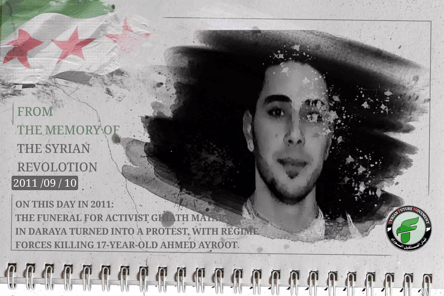 On this day in 2011: the people of Daraya held a funeral for activist Ghiath Matar, who was killed under torture after his arrest. Despite the presence of regime forces, the funeral turned into a protest demanding the fall of the regime, and the forces responded with live ammunition, resulting in the death of 17-year-old Ahmed Suleiman Ayroot.
