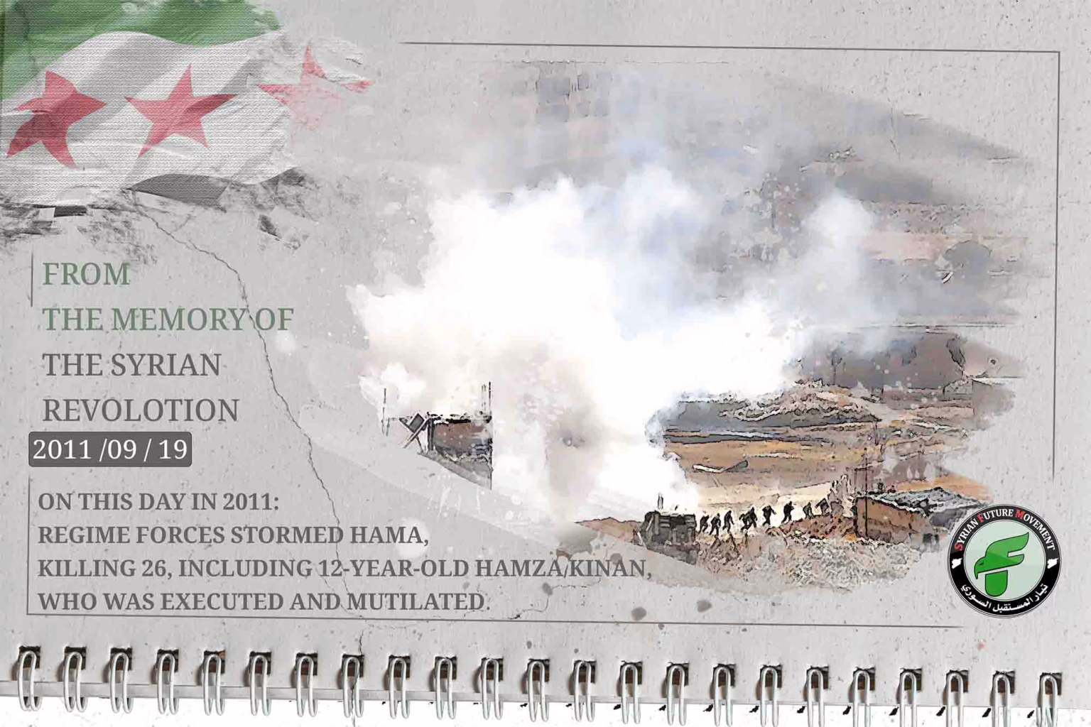 On this day in 2011: Regime forces stormed Hama, killing 26, including 12-year-old Hamza Kinan, who was executed and mutilated.