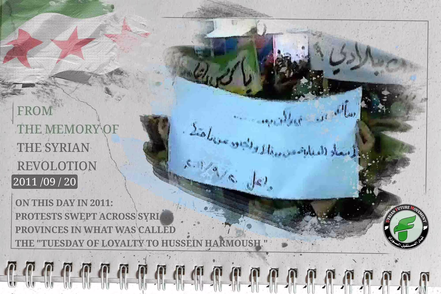 On this day in 2011: Protests swept across Syrian provinces in what was called the “Tuesday of Loyalty to Hussein Harmoush.”