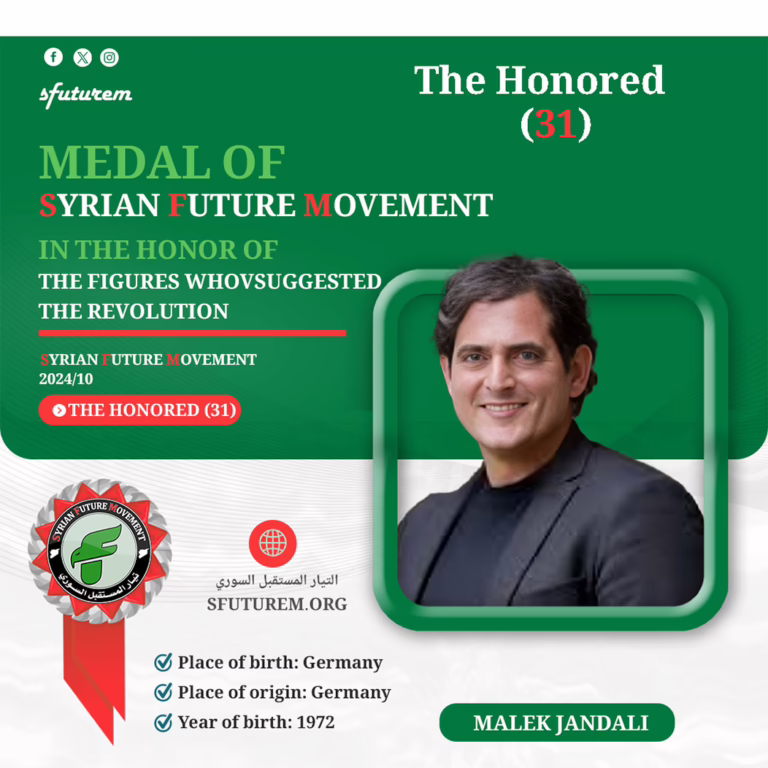 In the Syrian Future Movement, in recognition of his rich, artistic, humanitarian, and national legacy, and his steadfastness alongside his