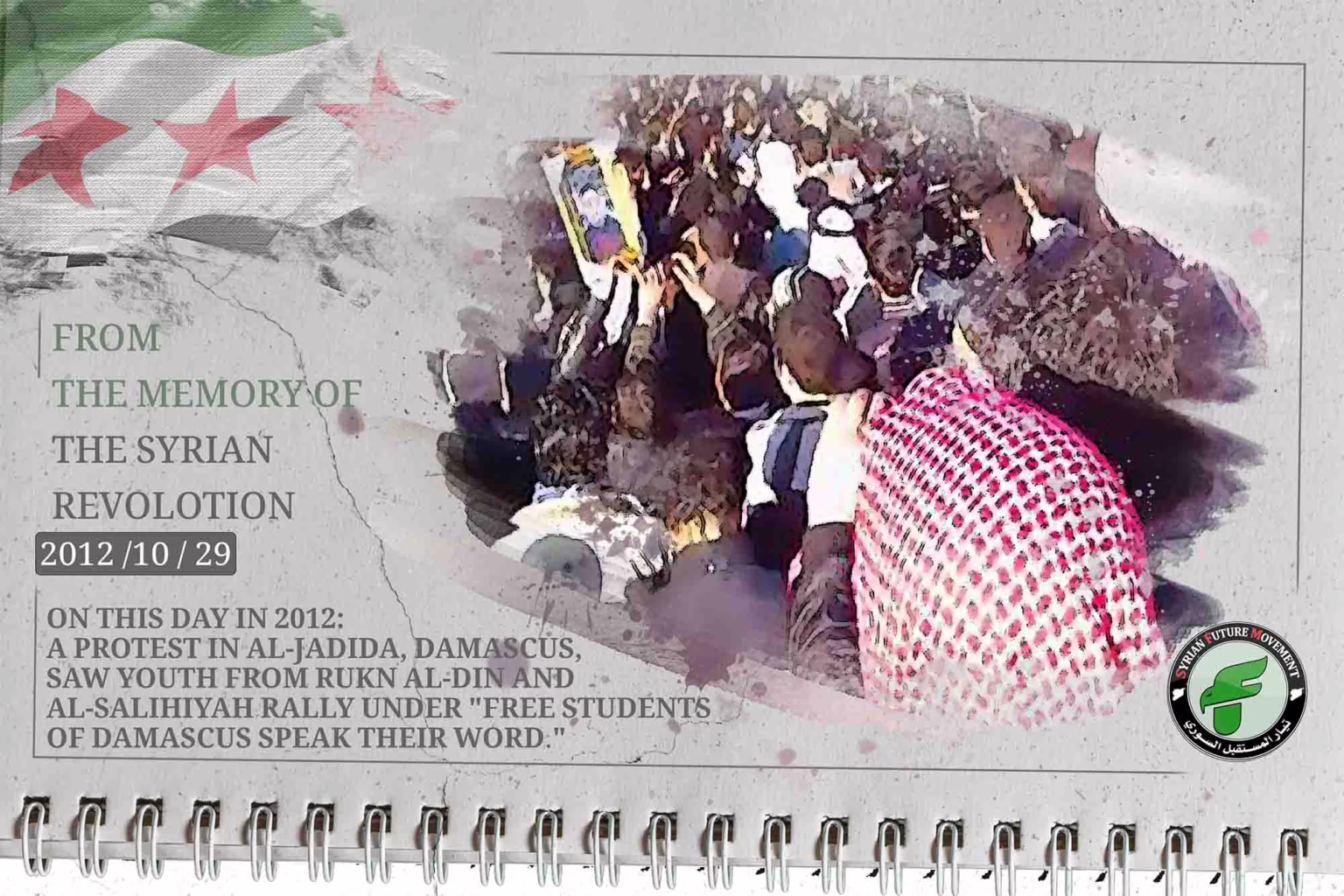 On this day in 2012: A demonstration took place in the Al-Jadida neighborhood of Damascus under the slogan “Free Students of Damascus Speak Their Word.” Young people from the Rukn al-Din and Al-Salihiyah neighborhoods participated, in coordination with the “Union of Free Students – Damascus Branch” and the “Union of Damascus School Coordinators.”