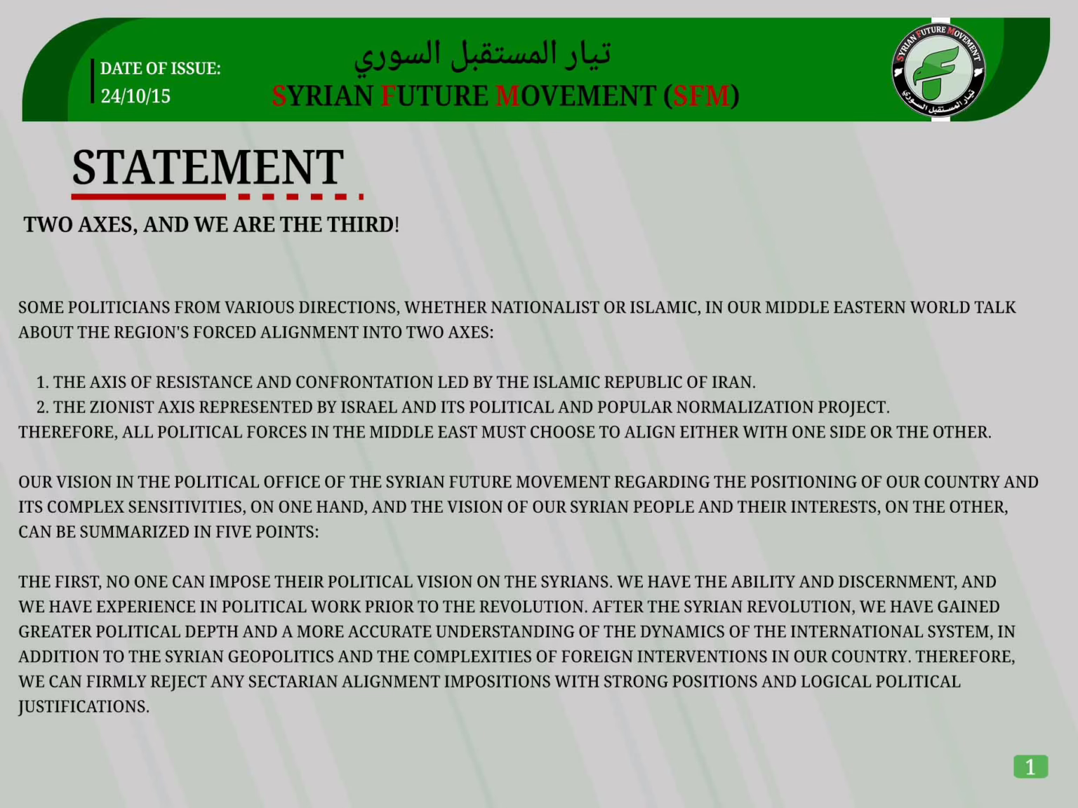 Our vision in the Political Office of the Syrian Future Movement regarding the positioning of our country and its complex sensitivities, on one hand, and the vision of our Syrian people and their interests, on the other, can be summarized in five points: