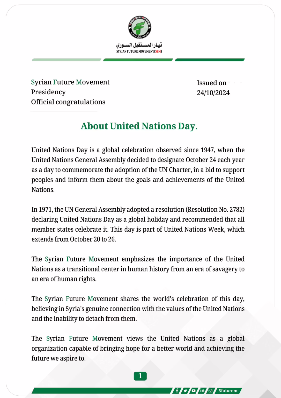The Syrian Future Movement shares the world’s celebration of this day, believing in Syria’s genuine connection with the values of the United Nations and the inability to detach from them.