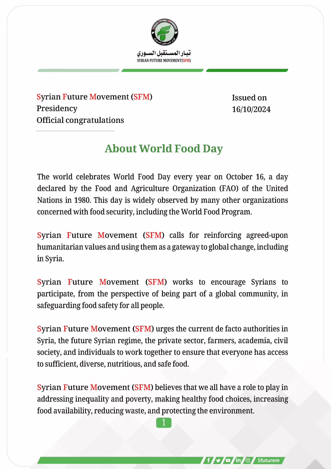The Syrian Future Movement (SFM) calls on all Syrian forces to agree on neutralizing food safety from conflict, ensuring food reaches all Syrians without discrimination, monopolization, or exploitation.