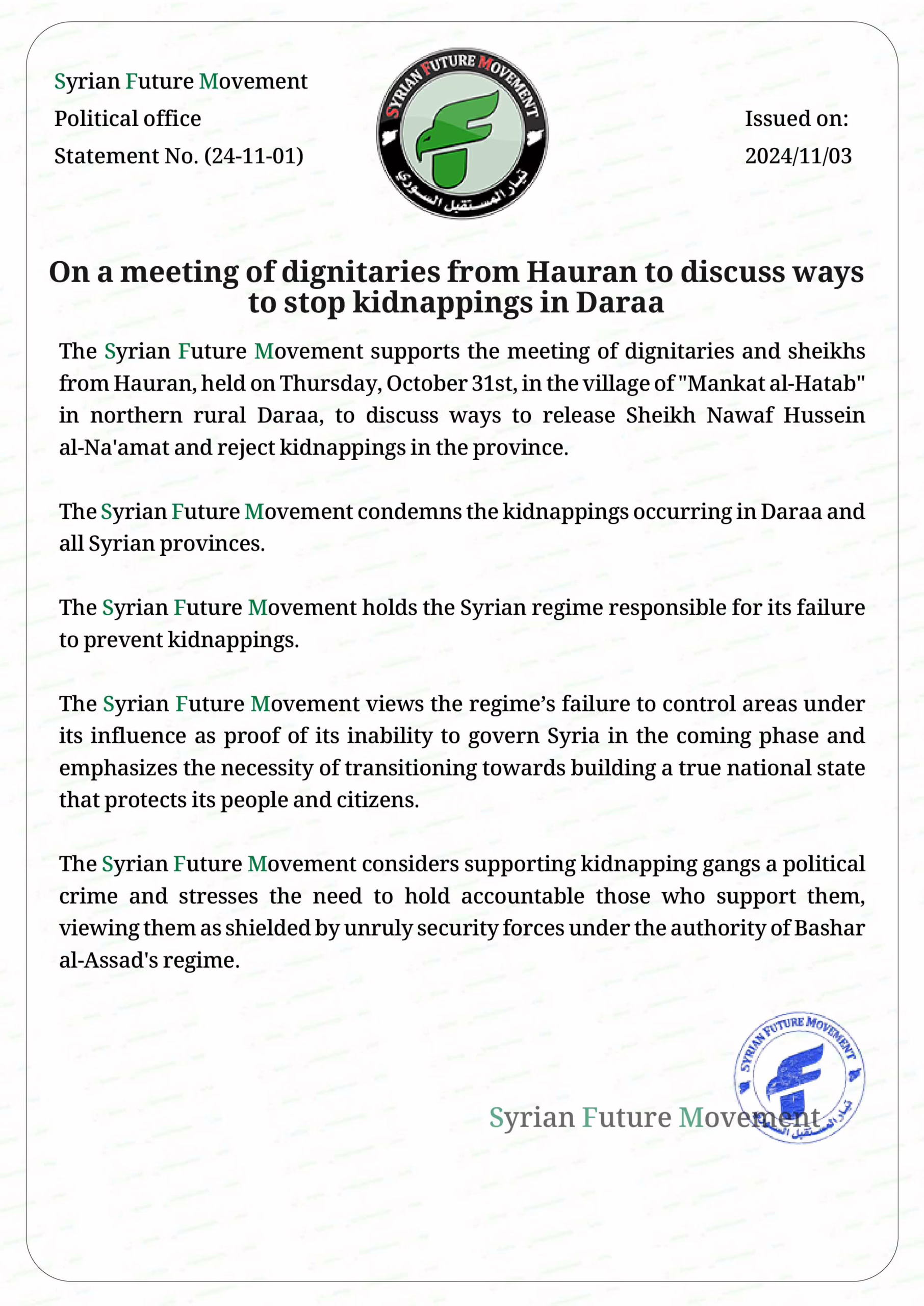 The Syrian Future Movement supports the meeting of dignitaries and sheikhs from Hauran, held on Thursday, October 31st, in the village of “Mankat al-Hatab” in northern rural Daraa, to discuss ways to release Sheikh Nawaf Hussein al-Na’amat and reject kidnappings in the province.