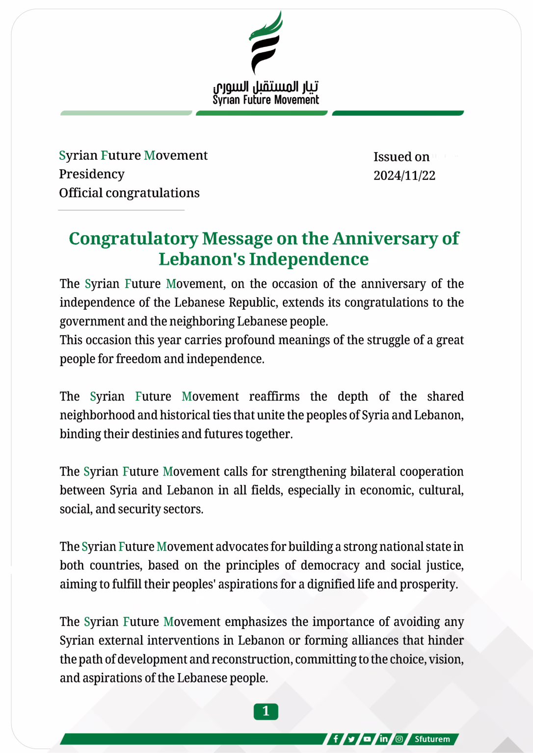 The Syrian Future Movement, on the occasion of the anniversary of the independence of the Lebanese Republic, extends its congratulations to the government and the neighboring Lebanese people.