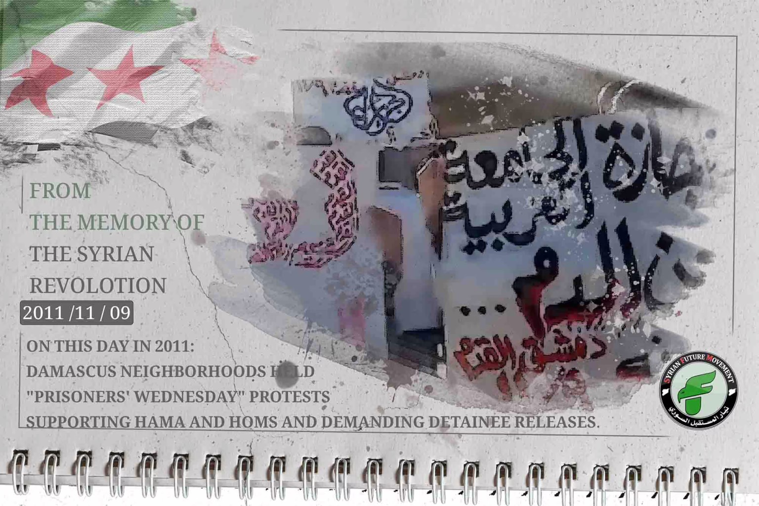 On this day in 2011: Several neighborhoods in Damascus witnessed demonstrations as part of “Prisoners’ Wednesday,” where residents protested in Rukn al-Din, al-Midan, Jobar, al-Qanawat, al-Mezzeh, Kafr Sousa, al-Qadam, al-Shaghour, Barzeh, al-Qaboun, and Nahr Aisha, showing support for Hama and Homs and calling for the release of detainees.
