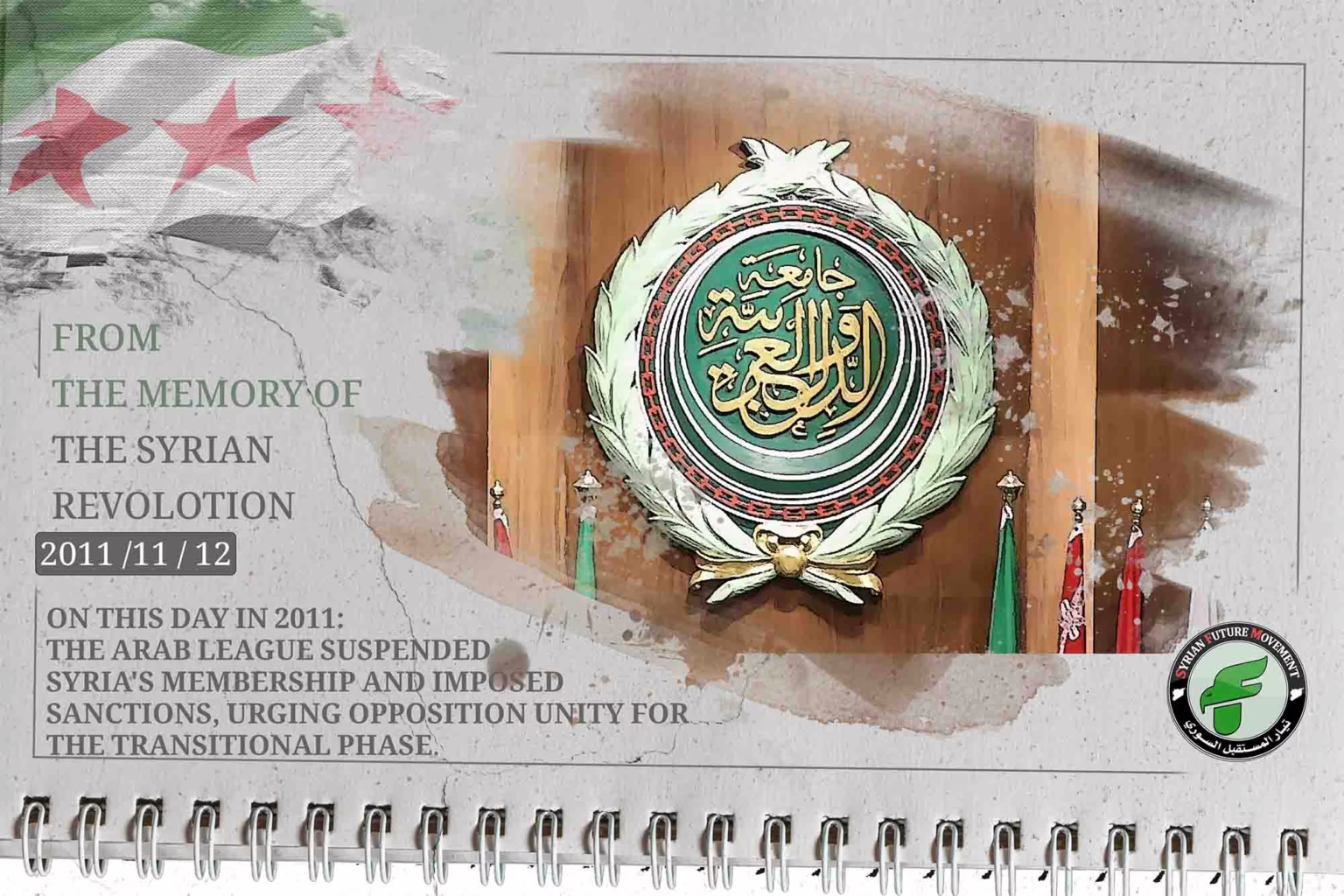 On this day in 2011: The Council of the Arab League issued Resolution No. 7438, which suspended the participation of delegations from the “Government of the Syrian Arab Republic” in the Council’s meetings and in all affiliated organizations and agencies until it fully implemented the commitments it had agreed upon under the Arab Action Plan. The Council also decided to impose several economic and political sanctions on the Syrian regime’s government, calling on the Syrian opposition to unite and meet at the League’s headquarters to agree on a unified vision for the upcoming transitional phase.