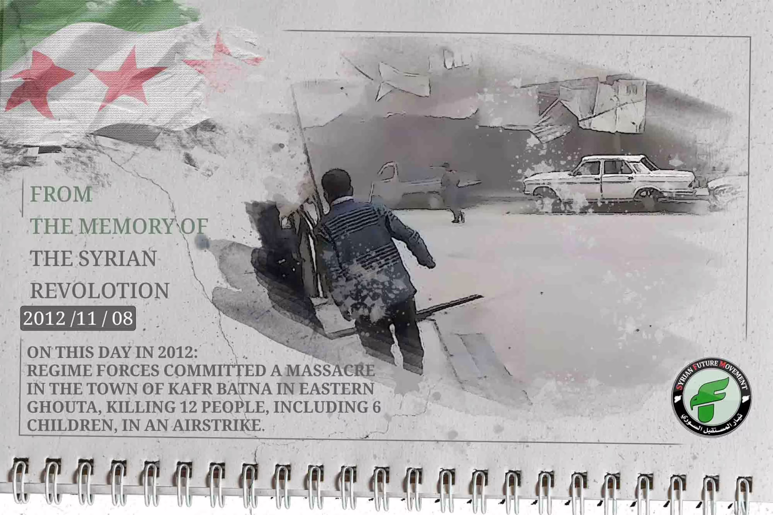 On this day in 2012: regime forces committed a massacre in the town of Kafr Batna in Eastern Ghouta, killing 12 people, including 6 children, in an airstrike.