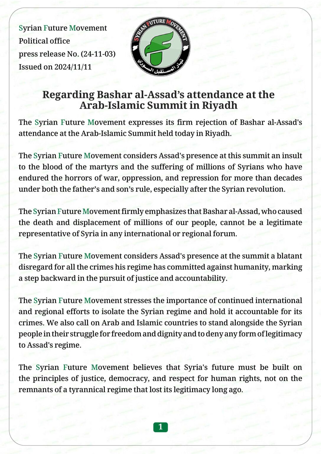 The Syrian Future Movement expresses its firm rejection of Bashar al-Assad’s attendance at the Arab-Islamic Summit held today in Riyadh.