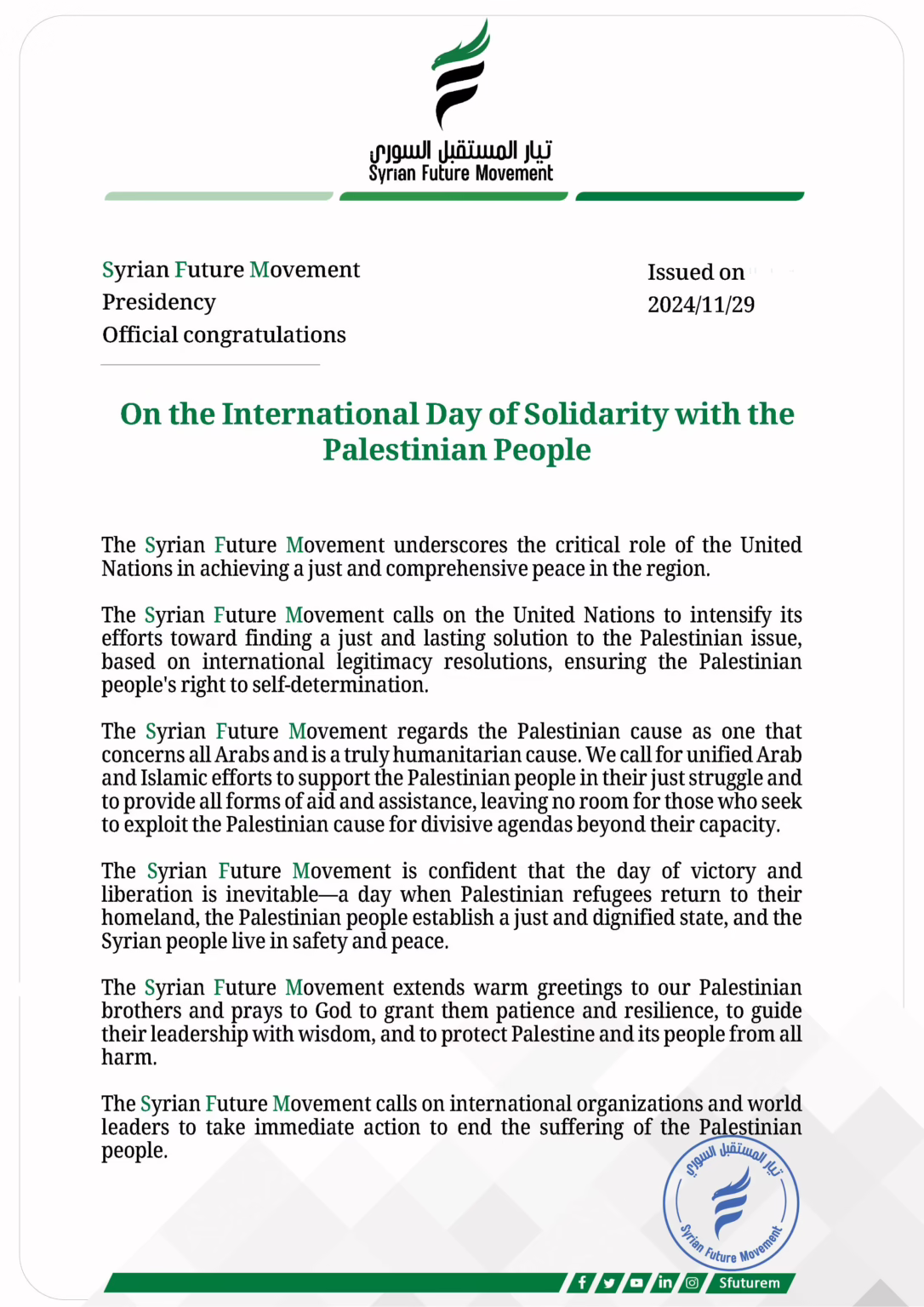 The Syrian Future Movement extends warm greetings to our Palestinian brothers and prays to God to grant them patience and resilience, to guide their leadership with wisdom, and to protect Palestine and its people from all harm.