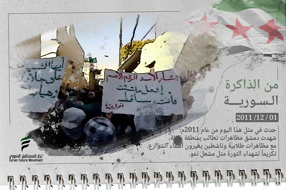 On this day in 2011: Damascus witnessed protests in the neighborhoods of Al-Midan, Al-Suweika, Barzeh, Kafr Sousa, and Jobar, demanding a buffer zone to protect civilians from the regime’s violations. Student protests also took place in Al-Midan, Al-Qadam, and Barzeh. Activists in Rukn al-Din changed the names of streets associated with the Assad family to the names of martyrs of the revolution, such as Mashaal Tammo.