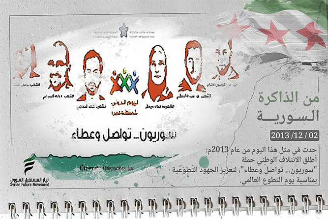 On this day in 2013: The National Coalition for Syrian Revolutionary and Opposition Forces launched the campaign “Syrians… Connection and Giving,” involving Syrian communities. The campaign included a range of volunteer activities on the occasion of International Volunteer Day, such as visiting childcare centers and facilities for people with special needs, assisting teams working there, and participating with municipalities in environmental beautification efforts.