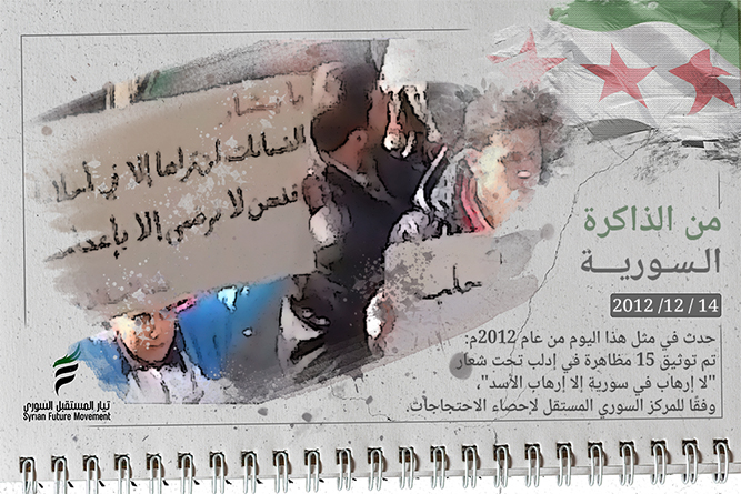 On this day in 2012: Fifteen protests were documented with video footage in Idlib Governorate under the slogan “No Terrorism in Syria Except Assad’s Terrorism,” according to the Syrian Independent Center for Protest Statistics.