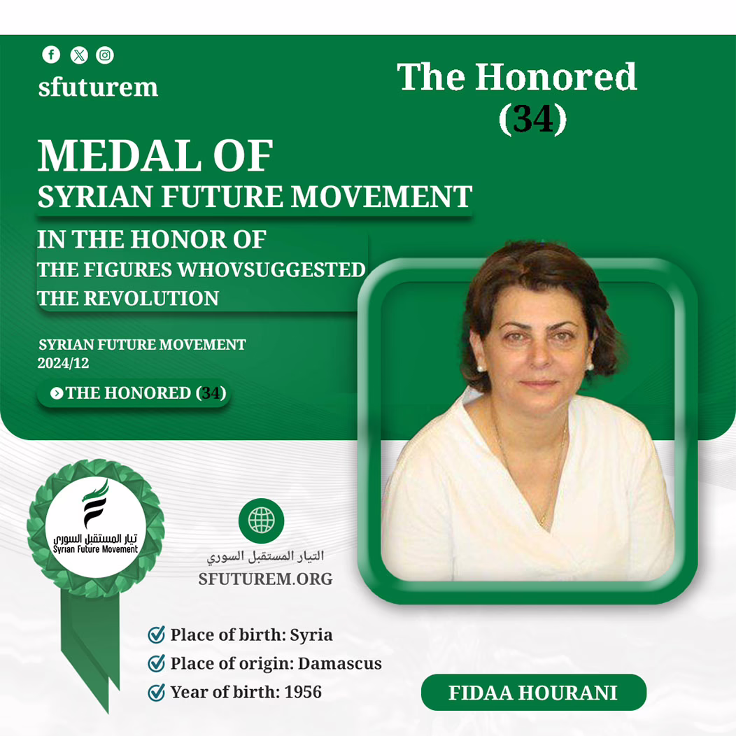 At the Syrian Future Movement, in recognition of her significant humanitarian and political legacy and her support for the Syrian people’s revolution against tyranny and injustice, we proudly present this week’s Syrian Future Movement Shield to the Syrian woman, Dr. Fidaa Hourani. This symbolic shield represents our national vision and collective commitment.