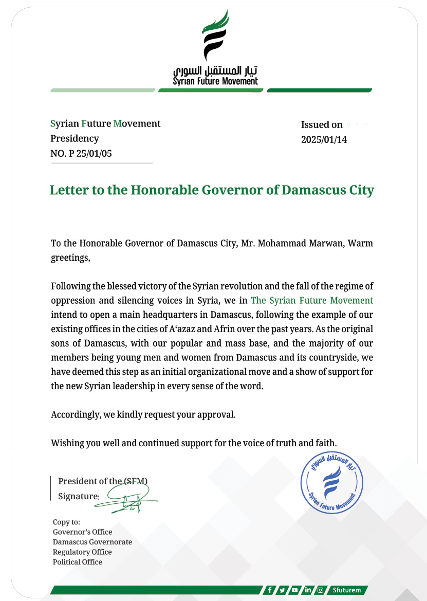 Following the blessed victory of the Syrian revolution and the fall of the regime of oppression and silencing voices in Syria, we in The Syrian Future Movement intend to open a main headquarters in Damascus, following the example of our existing offices in the cities of A‘azaz and Afrin over the past years. As the original sons of Damascus, with our popular and mass base, and the majority of our members being young men and women from Damascus and its countryside, we have deemed this step as an initial organizational move and a show of support for the new Syrian leadership in every sense of the word.