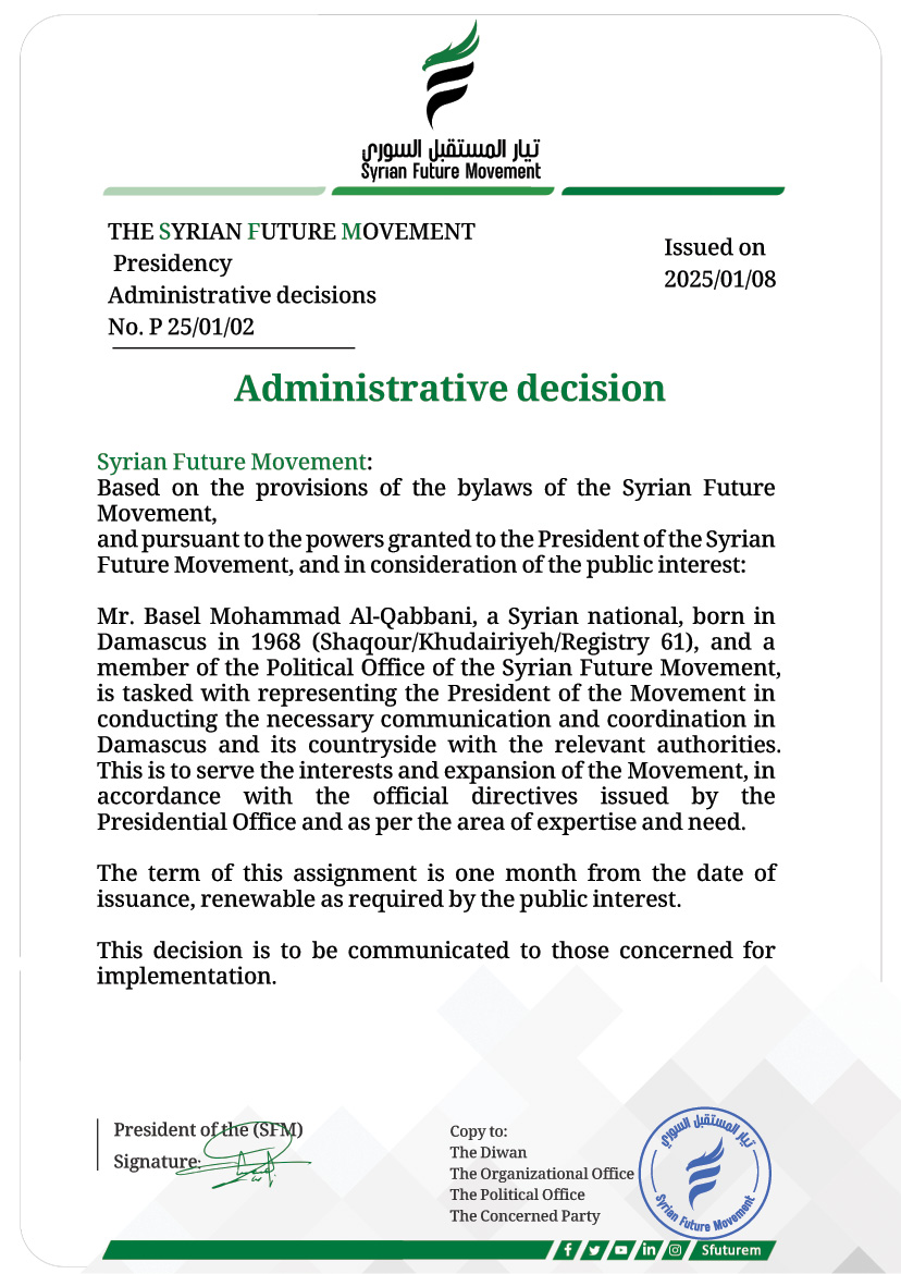 Mr. Basel Mohammad Al-Qabbani, a Syrian national, born in Damascus in 1968 (Shaqour/Khudairiyeh/Registry 61), and a member of the Political Office of the Syrian Future Movement, is tasked with representing the President of the Movement in conducting the necessary communication and coordination in Damascus and its countryside with the relevant authorities. This is to serve the interests and expansion of the Movement, in accordance with the official directives issued by the Presidential Office and as per the area of expertise and need.