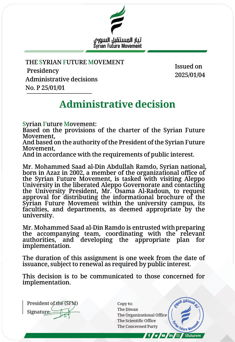 1. Mr. Mohammed Saad al-Din Abdullah Ramdo, Syrian national, born in Azaz in 2002, a member of the organizational office of the Syrian Future Movement, is tasked with visiting Aleppo University in the liberated Aleppo Governorate and contacting the University President, Mr. Osama Al-Radoun, to request approval for distributing the informational brochure of the Syrian Future Movement within the university campus, its faculties, and departments, as deemed appropriate by the university.