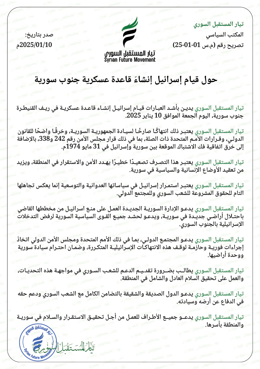 The Syrian Future Movement strongly condemns Israel’s establishment of a military base in the Quneitra countryside in southern Syria today, Friday, January 10, 2025.