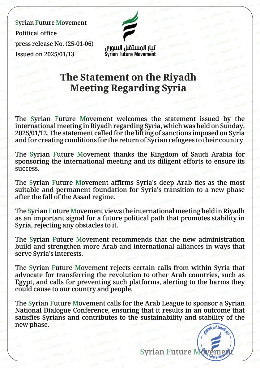 The Syrian Future Movement welcomes the statement issued by the international meeting in Riyadh regarding Syria, which was held on Sunday, 2025/01/12. The statement called for the lifting of sanctions imposed on Syria and for creating conditions for the return of Syrian refugees to their country.