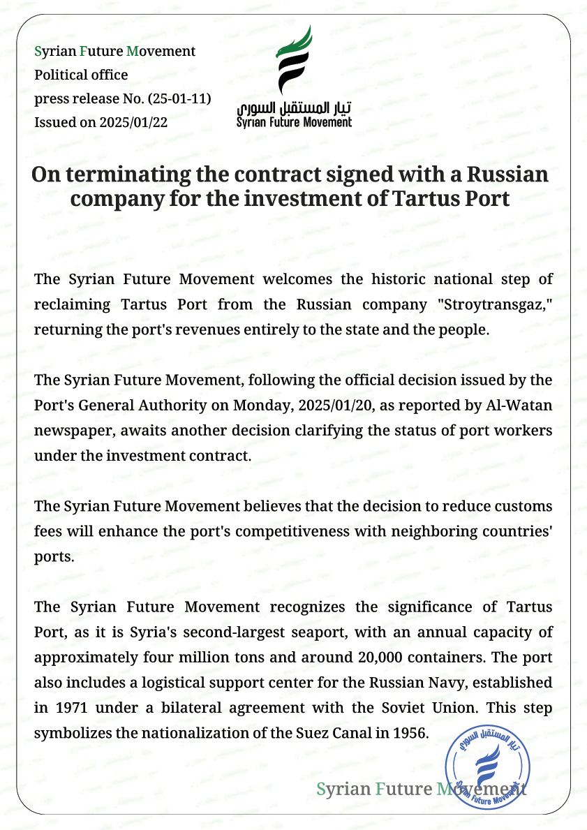 The Syrian Future Movement welcomes the historic national step of reclaiming Tartus Port from the Russian company “Stroytransgaz,” returning the port’s revenues entirely to the state and the people.