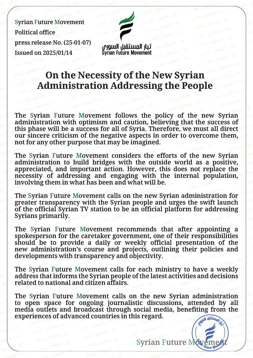 The Syrian Future Movement calls on the new Syrian administration for greater transparency with the Syrian people and urges the swift launch of the official Syrian TV station to be an official platform for addressing Syrians primarily.