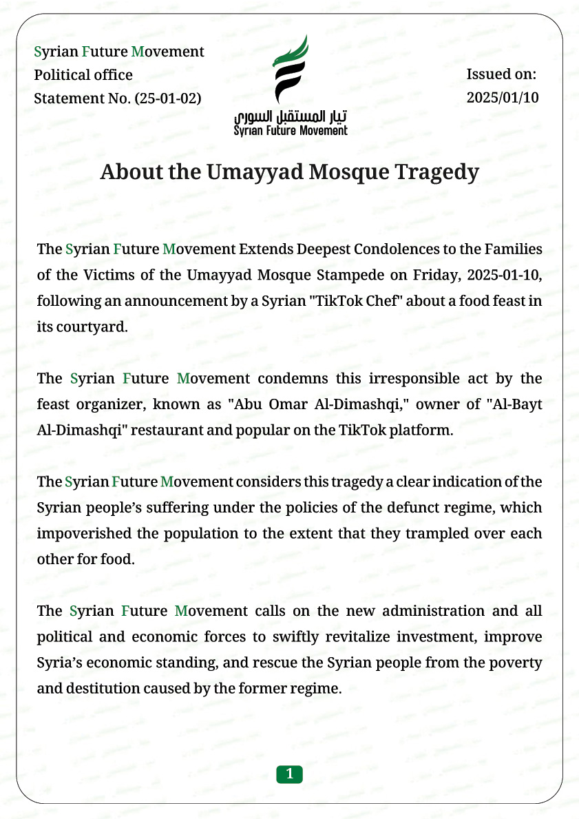 The Syrian Future Movement Extends Deepest Condolences to the Families of the Victims of the Umayyad Mosque Stampede on Friday, January 10, 2025, following an announcement by a Syrian “TikTok Chef” about a food feast in its courtyard.
