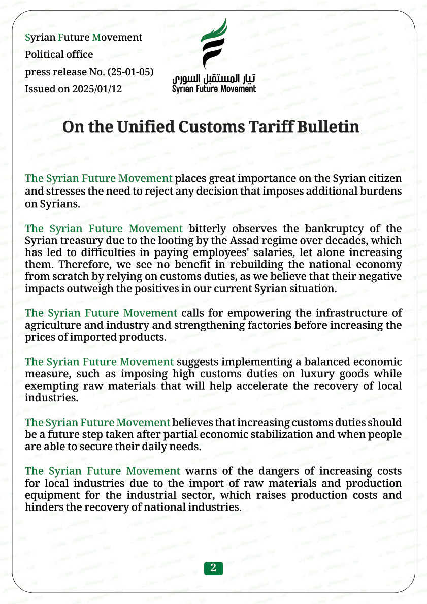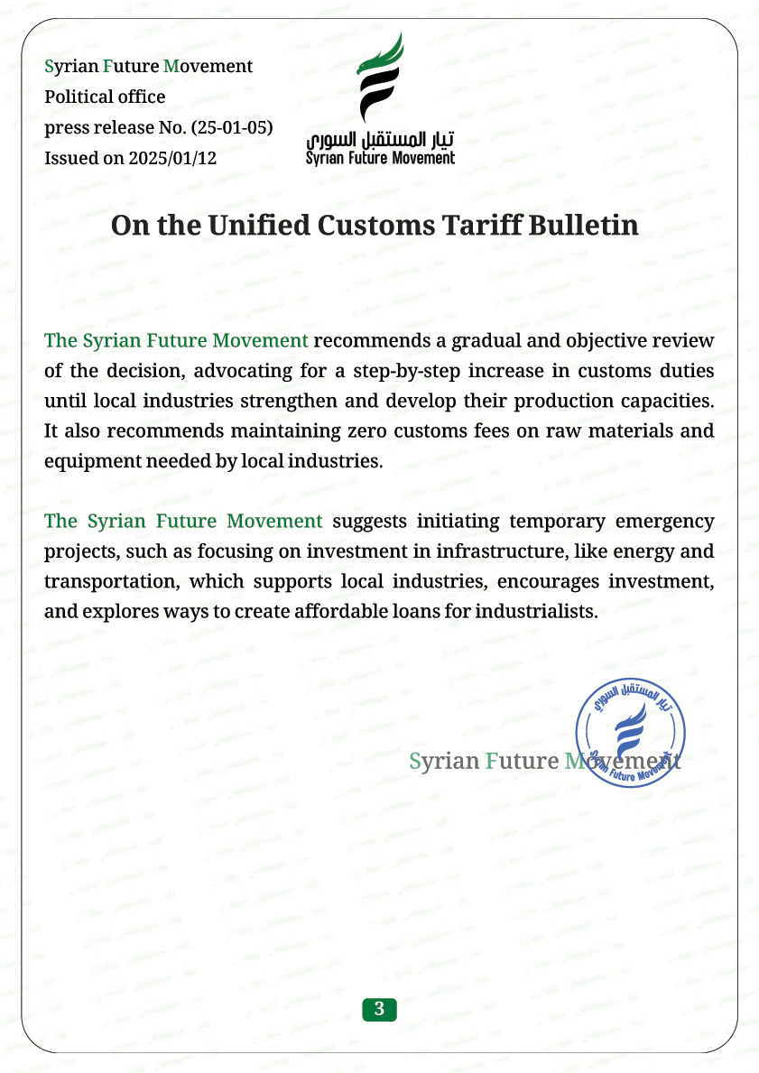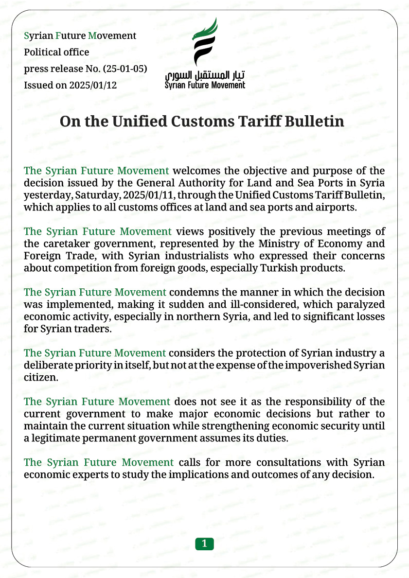The Syrian Future Movement welcomes the objective and purpose of the decision issued by the General Authority for Land and Sea Ports in Syria yesterday, Saturday, 2025/01/11, through the Unified Customs Tariff Bulletin, which applies to all customs offices at land and sea ports and airports.
