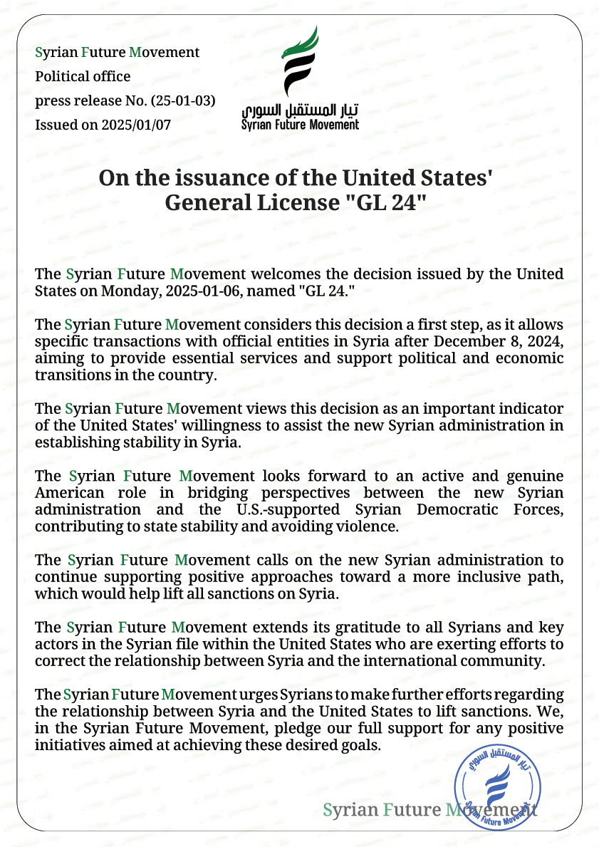 The Syrian Future Movement welcomes the decision issued by the United States on Monday, 2025-01-06, named “GL 24.”