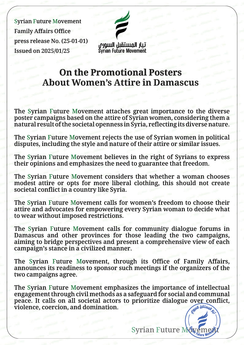 The Syrian Future Movement rejects the use of Syrian women in political disputes, including the style and nature of their attire or similar issues.