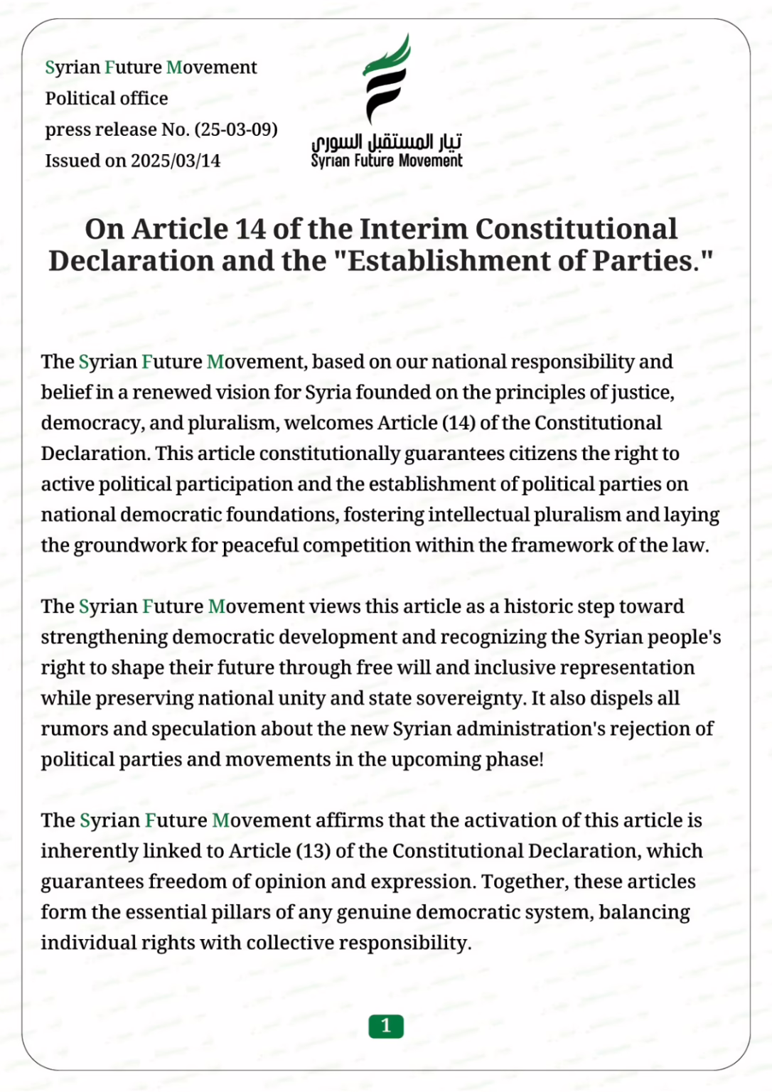 The Syrian Future Movement, based on our national responsibility and belief in a renewed vision for Syria founded on the principles of justice, democracy, and pluralism, welcomes Article (14) of the Constitutional Declaration. This article constitutionally guarantees citizens the right to active political participation and the establishment of political parties on national democratic foundations, fostering intellectual pluralism and laying the groundwork for peaceful competition within the framework of the law.