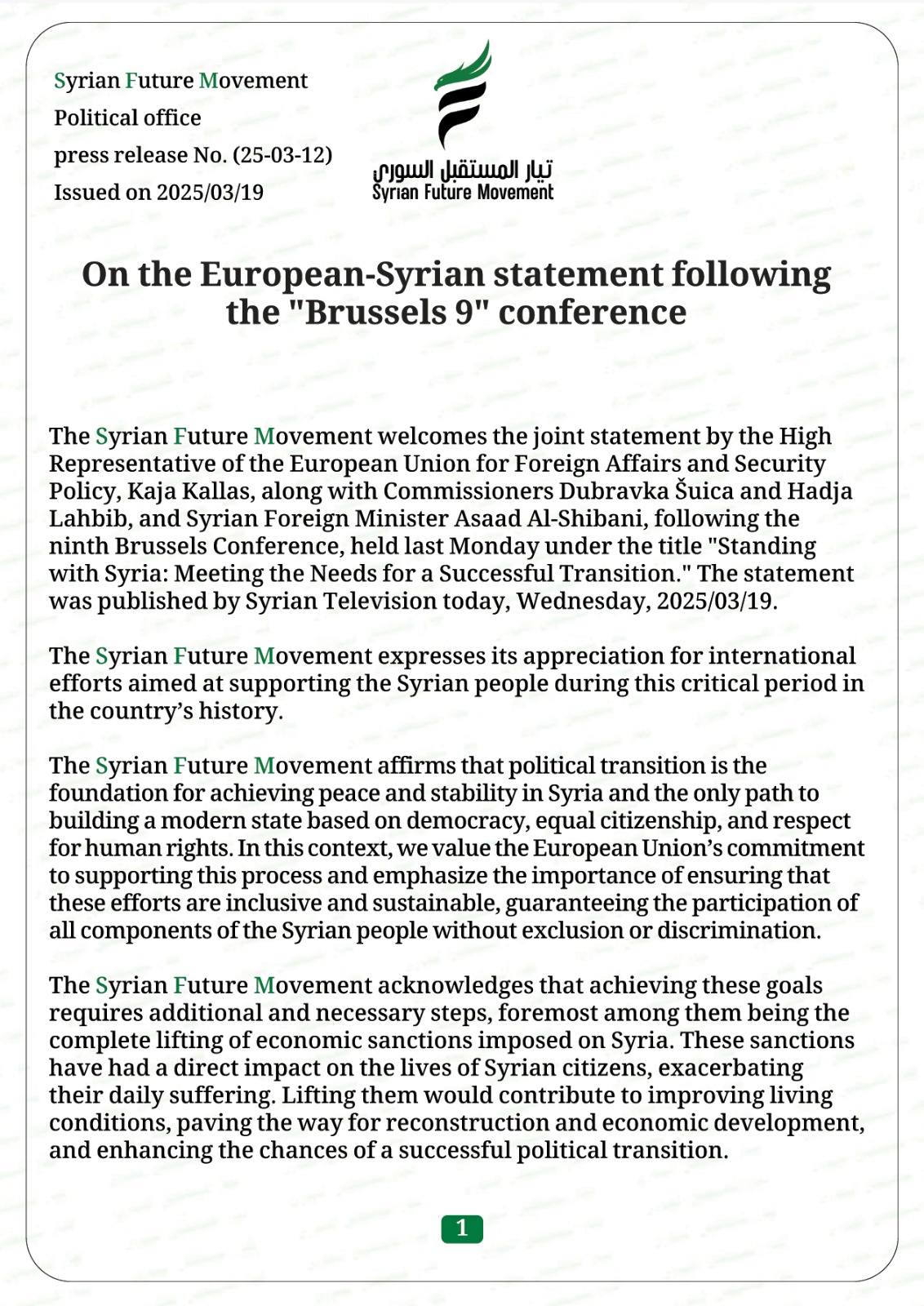 The Syrian Future Movement welcomes the joint statement by the High Representative of the European Union for Foreign Affairs and Security Policy, Kaja Kallas, along with Commissioners Dubravka Šuica and Hadja Lahbib, and Syrian Foreign Minister Asaad Al-Shibani, following the ninth Brussels Conference, held last Monday under the title “Standing with Syria: Meeting the Needs for a Successful Transition.” The statement was published by Syrian Television today, Wednesday, 2025/03/19.