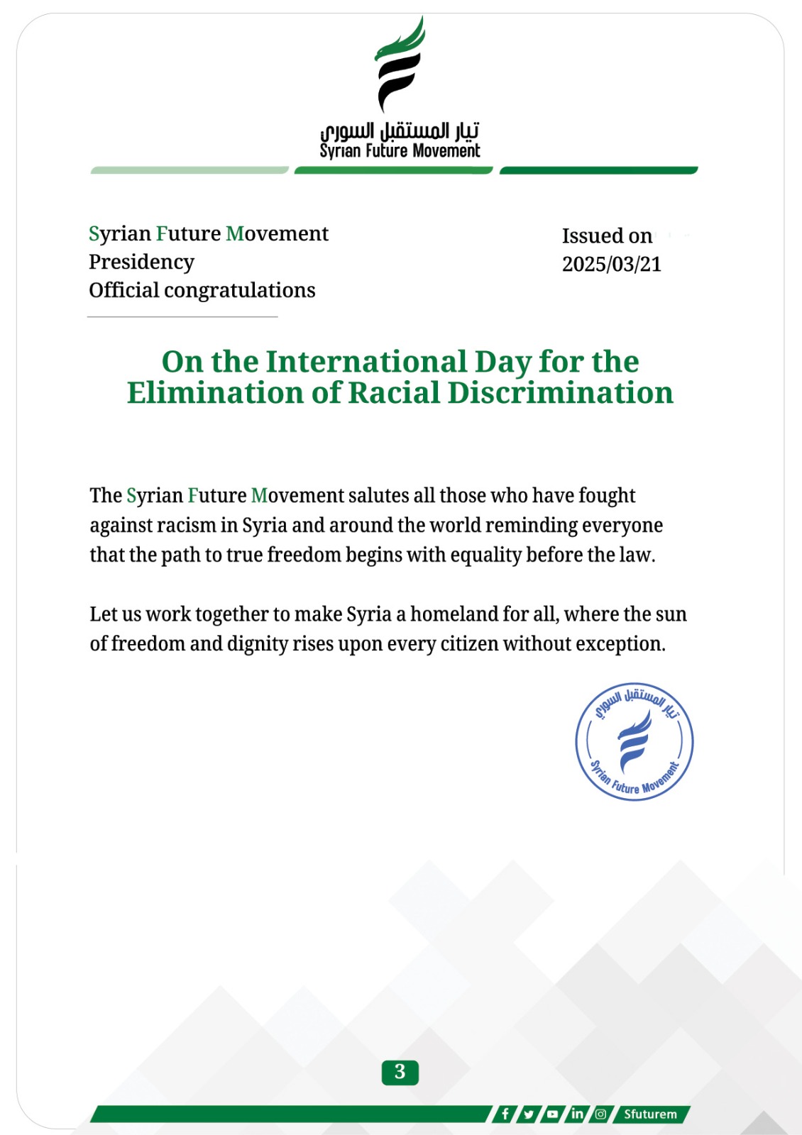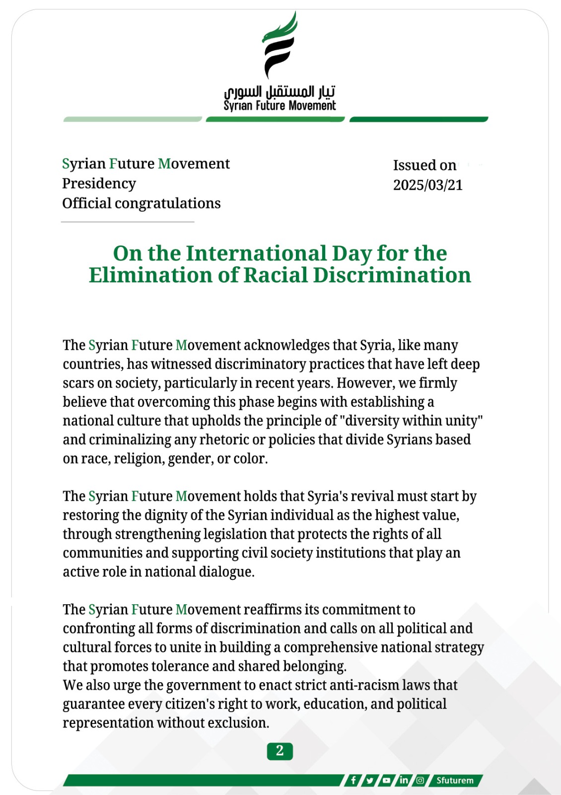 The Syrian Future Movement affirms that combating racial discrimination is not just a moral duty but a fundamental condition for achieving national reconciliation and building a future Syria based on equal citizenship and social justice.