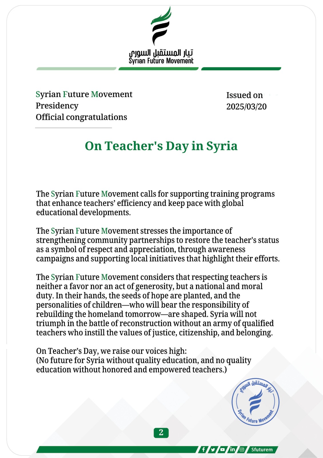 The Syrian Future Movement, on this day when we honor the contributions of teachers, raises its voice from the heart of Syria to extend a salute of reverence and appreciation to the bearers of the noble message—the mission of shaping minds and enlightening generations. A teacher is not merely a transmitter of knowledge but the cornerstone in shaping the nation’s future, the architect of its awareness, and the guardian of its values and human heritage.