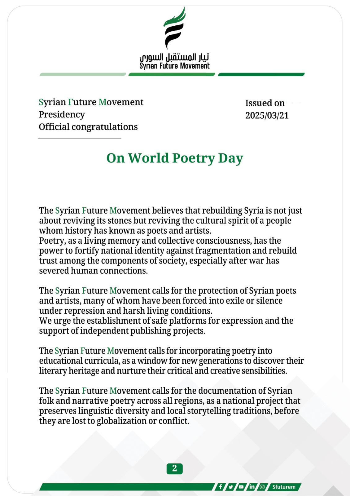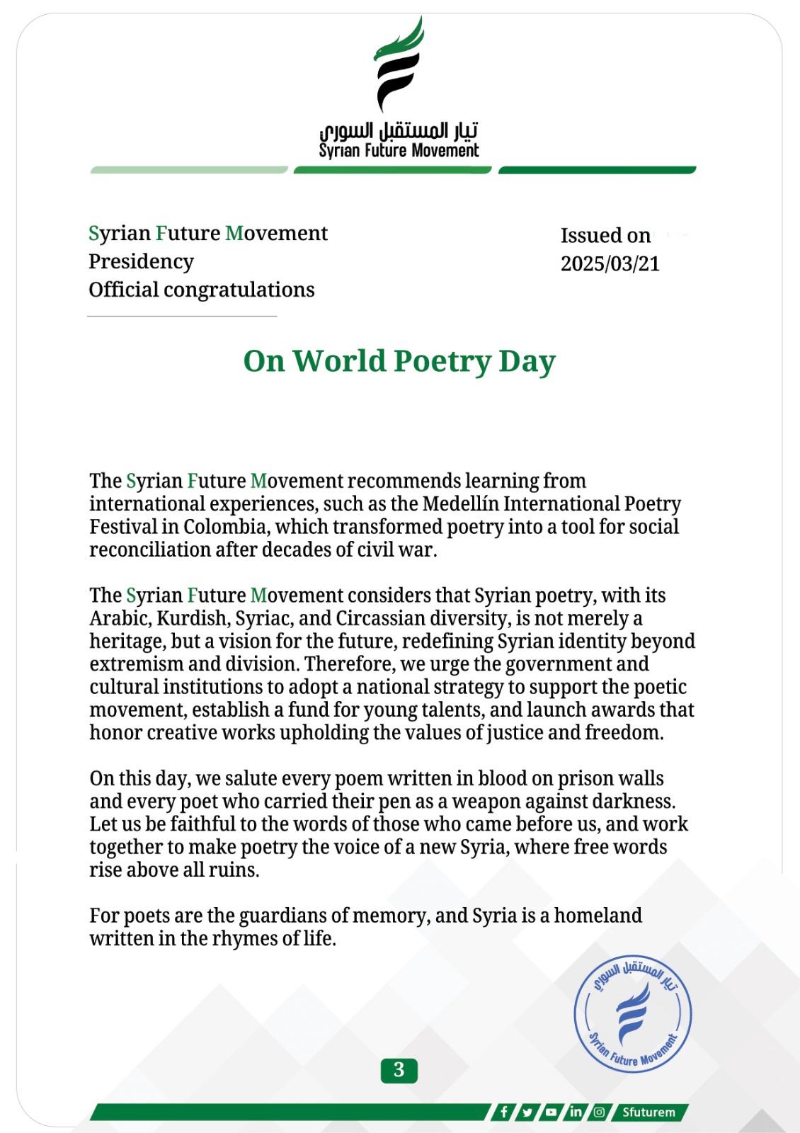 The Syrian Future Movement considers that Syrian poetry, with its Arabic, Kurdish, Syriac, and Circassian diversity, is not merely a heritage, but a vision for the future, redefining Syrian identity beyond extremism and division. Therefore, we urge the government and cultural institutions to adopt a national strategy to support the poetic movement, establish a fund for young talents, and launch awards that honor creative works upholding the values of justice and freedom.