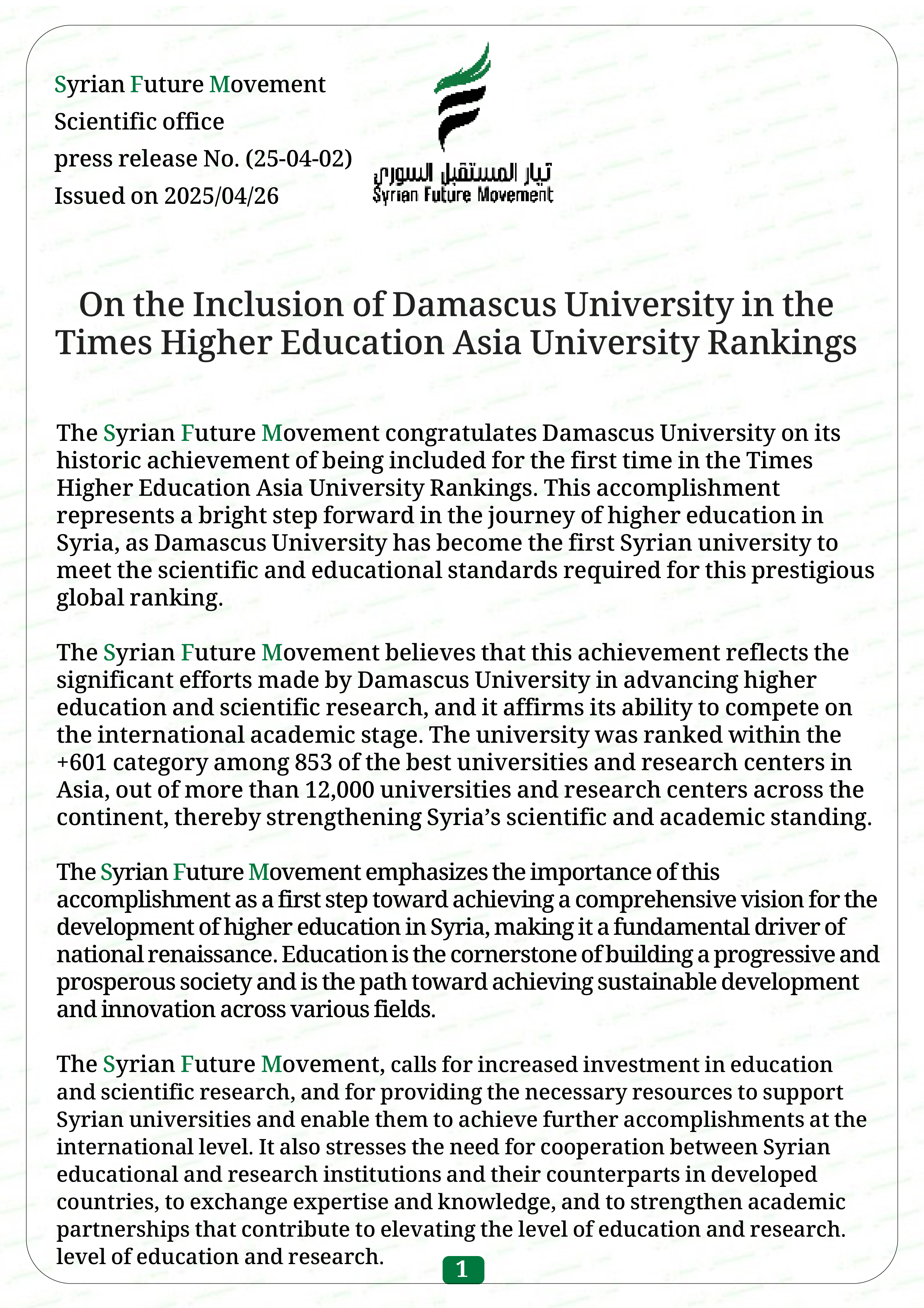 The Syrian Future Movement congratulates Damascus University on its historic achievement of being included for the first time in the Times Higher Education Asia University Rankings. This accomplishment represents a bright step forward in the journey of higher education in Syria, as Damascus University has become the first Syrian university to meet the scientific and educational standards required for this prestigious global ranking.