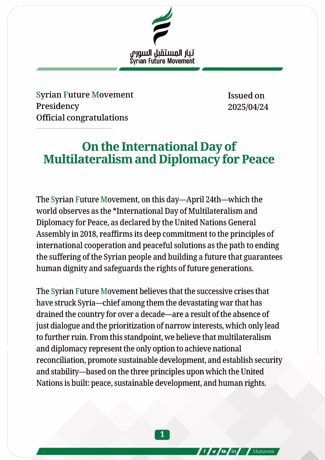 The Syrian Future Movement, on this day—April 24th—which the world observes as the *International Day of Multilateralism and Diplomacy for Peace, as declared by the United Nations General Assembly in 2018, reaffirms its deep commitment to the principles of international cooperation and peaceful solutions as the path to ending the suffering of the Syrian people and building a future that guarantees human dignity and safeguards the rights of future generations.