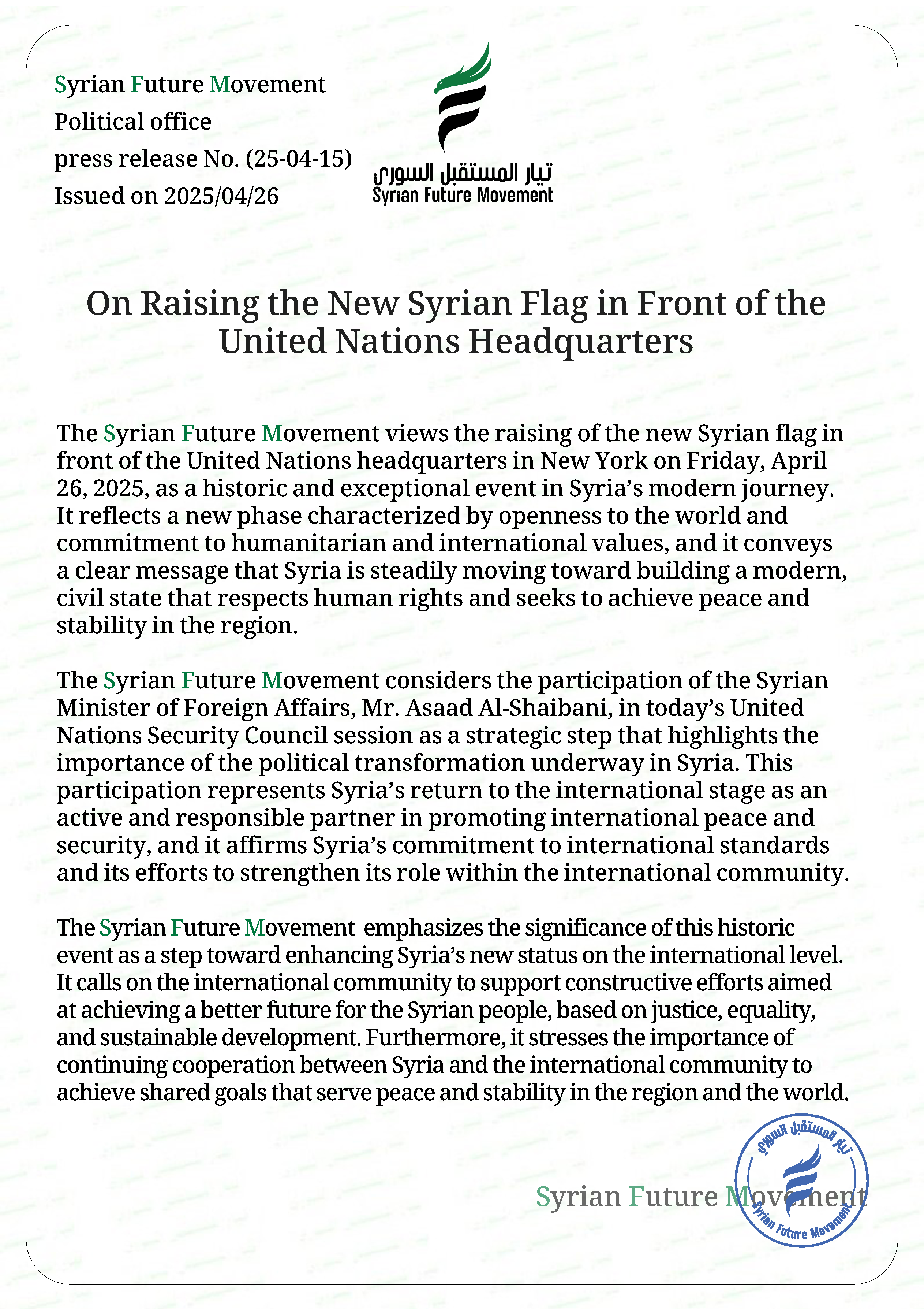The Syrian Future Movement views the raising of the new Syrian flag in front of the United Nations headquarters in New York on Friday, April 26, 2025, as a historic and exceptional event in Syria’s modern journey. It reflects a new phase characterized by openness to the world and commitment to humanitarian and international values, and it conveys a clear message that Syria is steadily moving toward building a modern, civil state that respects human rights and seeks to achieve peace and stability in the region.
