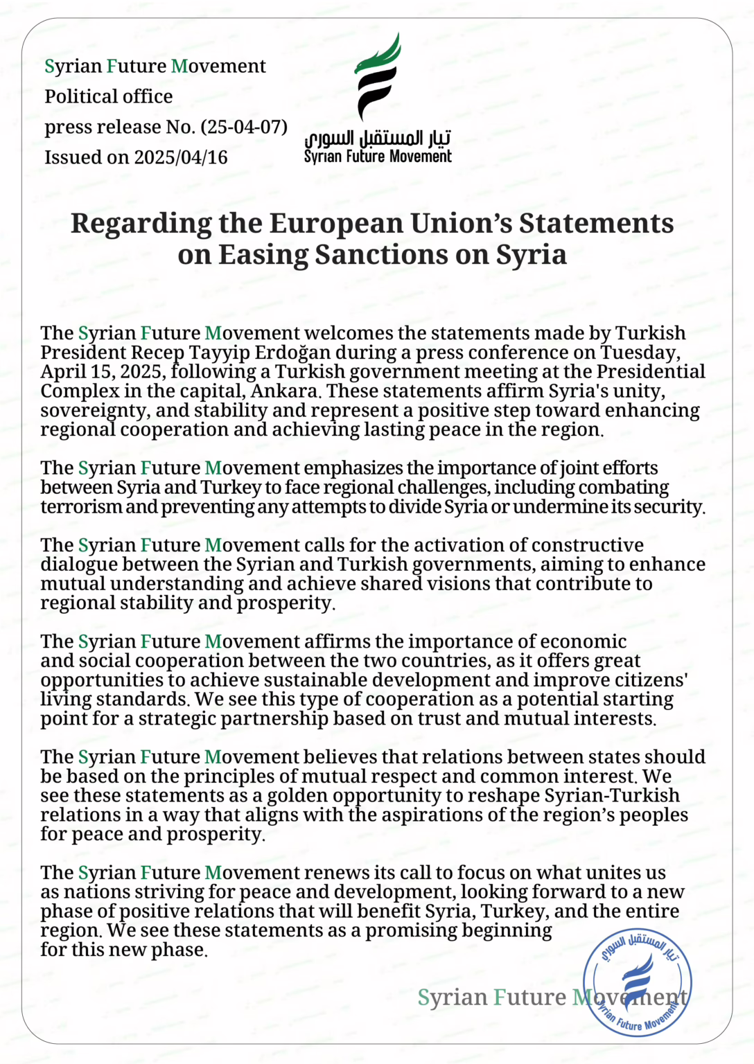 The Syrian Future Movement welcomes the statements made by Turkish President Recep Tayyip Erdoğan during a press conference on Tuesday, April 15, 2025, following a Turkish government meeting at the Presidential Complex in the capital, Ankara. These statements affirm Syria’s unity, sovereignty, and stability and represent a positive step toward enhancing regional cooperation and achieving lasting peace in the region.