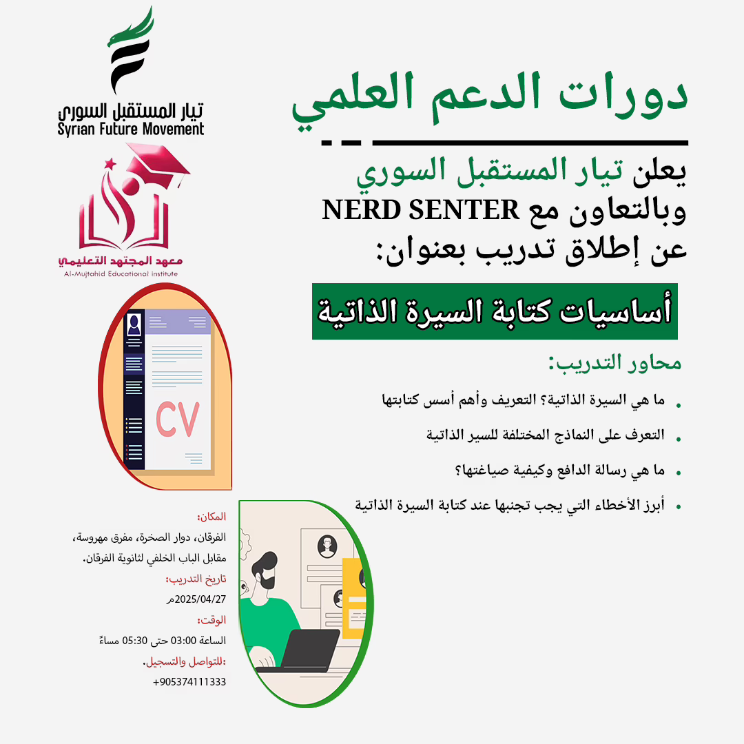 The Syrian Future Movement, in collaboration with NERD SENTER, announces the organization of a free training course titled “Fundamentals of CV Writing,” aimed at equipping participants with the essential skills to craft a professional CV and a strong motivation letter.