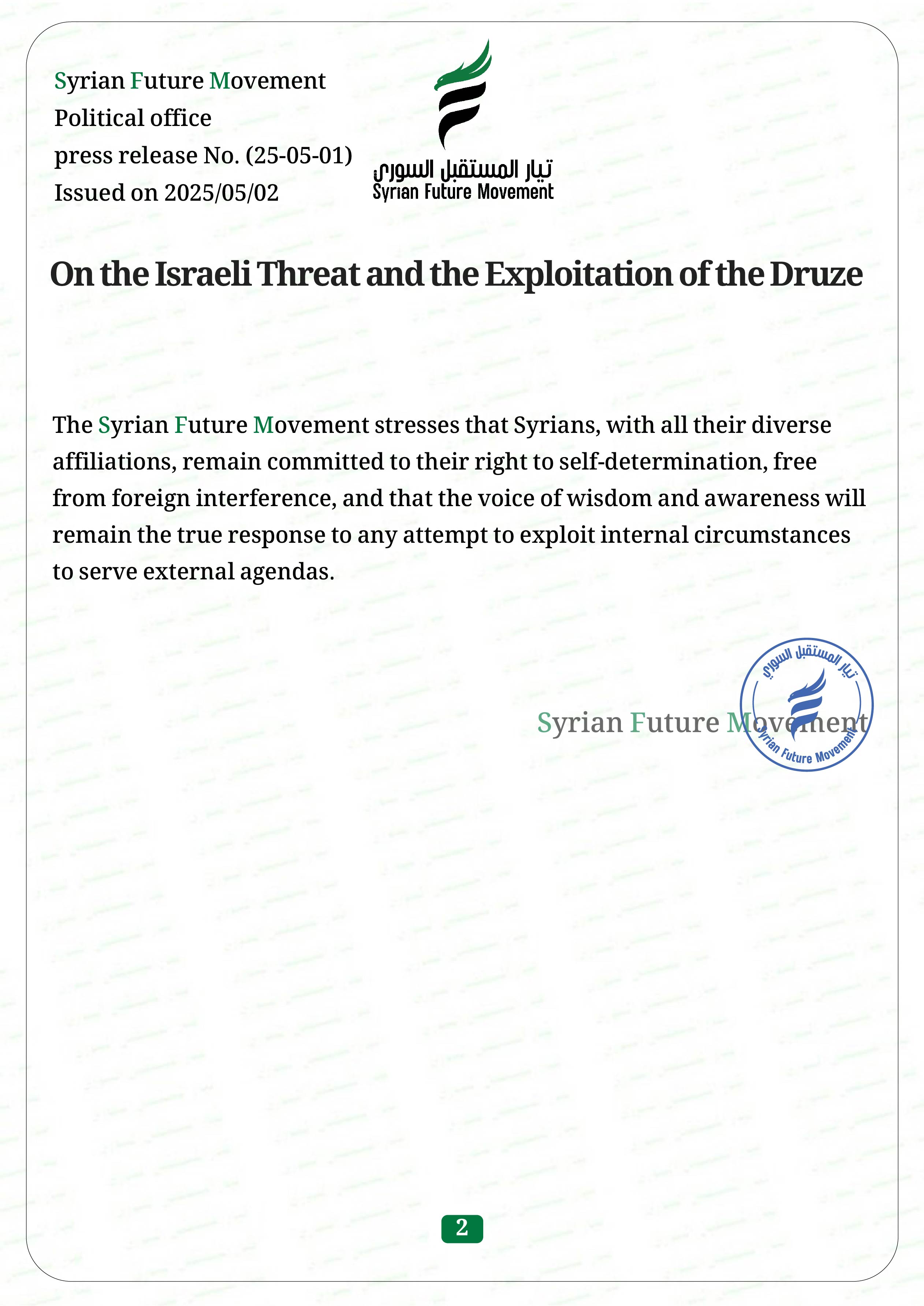The Syrian Future Movement stresses that Syrians, with all their diverse affiliations, remain committed to their right to self-determination, free from foreign interference, and that the voice of wisdom and awareness will remain the true response to any attempt to exploit internal circumstances to serve external agendas.