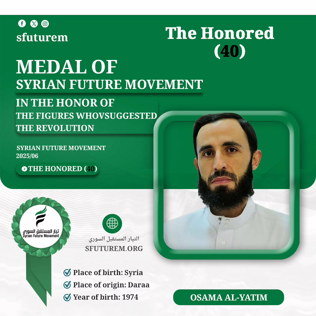 , we present this week’s Syrian Future Movement shield to Osama Al-Yateem, the judge of truth. We present him with a symbolic Syrian shield that carries our vision and our inclusive national approach.