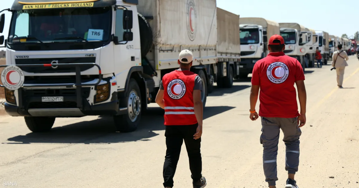 Under the supervision of the Red Crescent… A new humanitarian aid convoy arrives in Sweida.