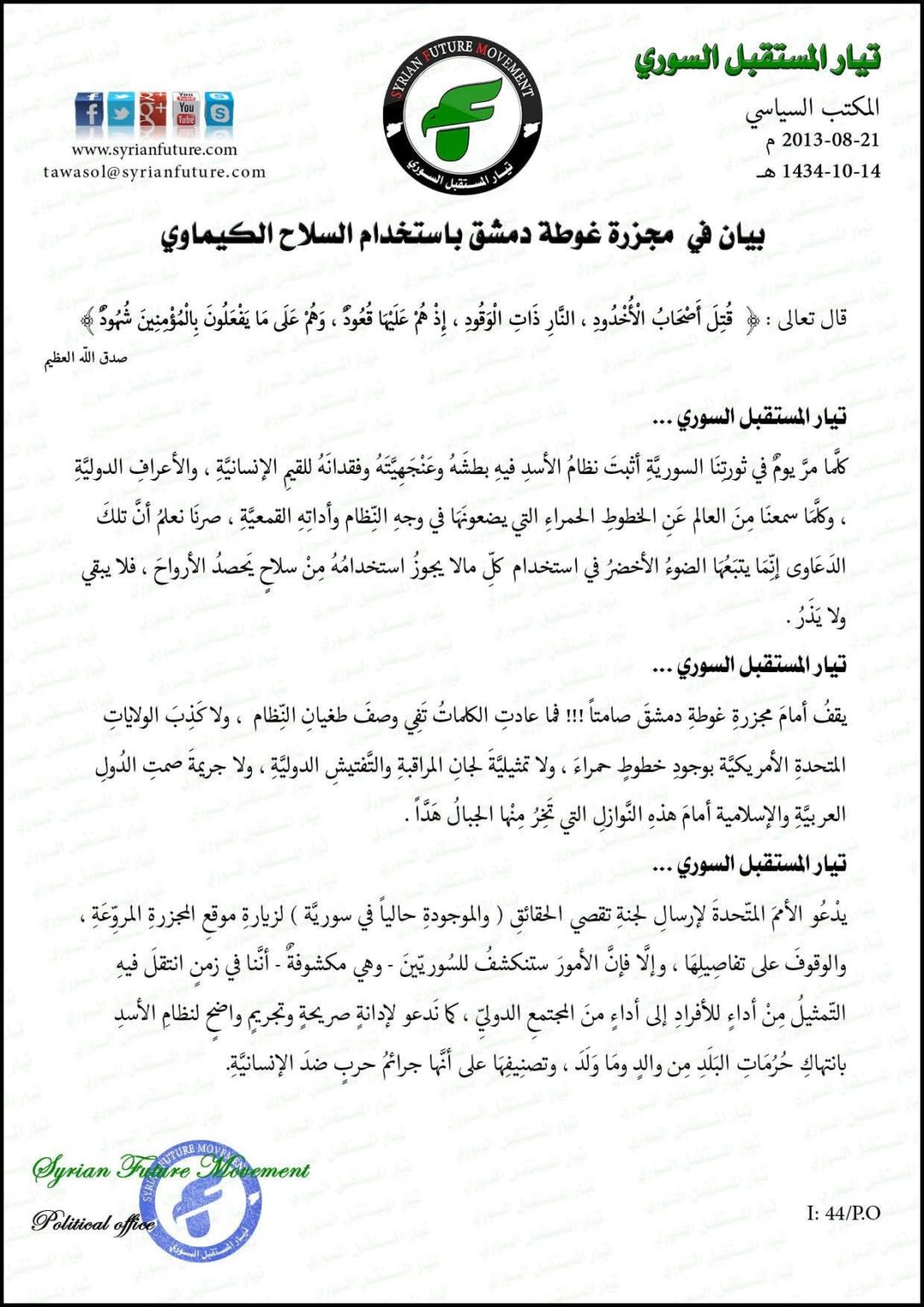 We, in the Syrian Future Movement, will continue to emphasize the need to commemorate the anniversary annually so that it remains vivid in the revolutionary memory, while pursuing war criminals to prevent the recurrence of such crimes and advance humanity’s transition toward justice and peace.